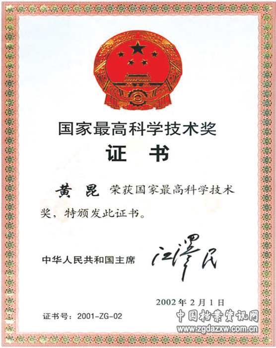黄昆荣获的2001年度国家最高科学技术奖证书