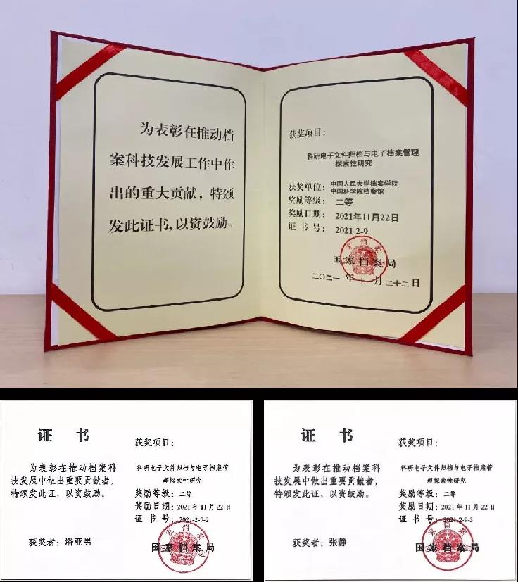 近日,中国人民大学档案学院和中国科学院档案馆合作完成的“科研电子文件归档与电子档案管理探索性研究”课题(以下简称“课题”)获得国家档案局2021年度优秀科技成果二等奖(一等奖空缺,二等奖共10项),中科院档案馆潘亚男、张静作为主要完成人获得奖励。