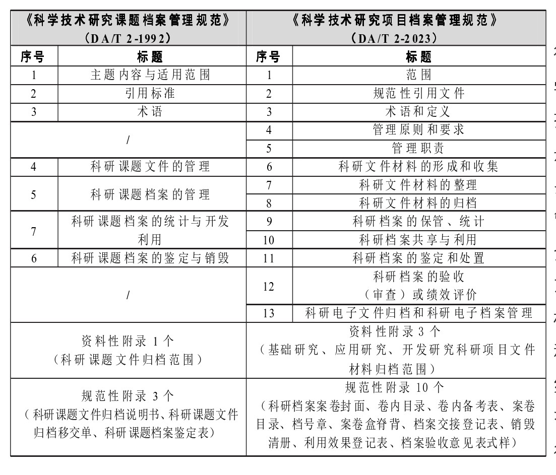 2023年5月29日,国家档案局发布了修订后的《科学技术研究项目档案管理规范》(DA/T 2-2023)(以下简称《规范》),代替了《科学技术研究课题档案管理规范》(DA/T 2-1992)(以下简称原《规范》),并于2023年12月1日开始实施。新修订的《规范》既是《科学技术研究档案管理规定》(国家档案局科技部令第15号)(以下简称“15号令”)在实践操作层面的具体延伸,也是提升新时期科研档案工作规范化管理水平的重要参照,对维护科研档案完整、准确、系统、安全和有效利用具有积极的引导作用。本文在对《规范》修订背景与主要内容分析的基础上,阐述了《规范》的特点与意义,并结合条款内容和科研档案工作实践对相关问题进行了思考。