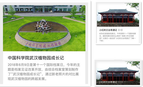 活动中围绕“档案见证改革开放”的主题,以园区建设的新老照片为素材制作了“中国科学院武汉植物园成长记”宣传文案,并在官方微信公众号推送,展现武汉植物园建园以来的跨越发展。同时制作档案宣传展板,介绍了国际档案日的由来、档案的作用、档案工作的基本内容、档案的保管期限等档案相关知识,并节选了中国档案报社国际档案日宣传活动制作发行的《小红的兰台奇遇记》宣传资料。结合档案信息化相关工作,还开展了档案问卷调查,了解全园职工在档案查阅中遇到的困难以及对信息化的需求。