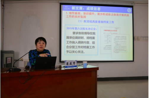 中科院档案馆馆长潘亚男做了题为《新形势 新发展 新任务》的报告,从国家和院的层面梳理了新时期档案工作的重要性和新要求,阐述了近年来全院档案工作取得的新发展和新成绩,指出了当前档案工作面临的新形势和新挑战,为理化所档案工作建设提出了指导性的建议。