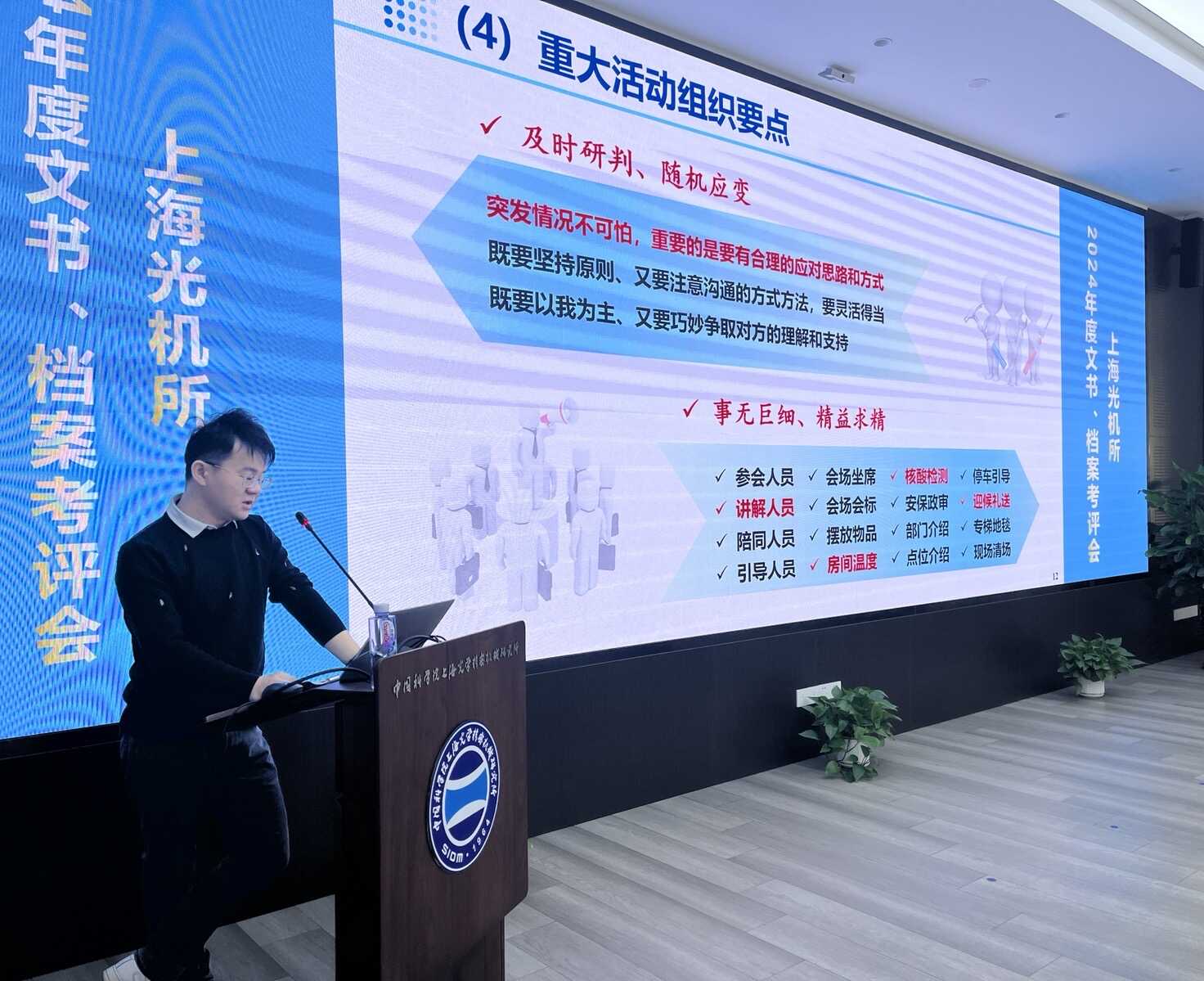 2025年1月21日上午,上海光机所举办“三办”能力培训暨2024年度公文、档案工作总结考评会。上海光机所党委委员、纪委书记彭芳及全所专兼职文书和档案员、职能支撑部门工作人员参加会议。会议由综合管理部副部长(主持工作)、党委办公室主任吴燕华主持。
