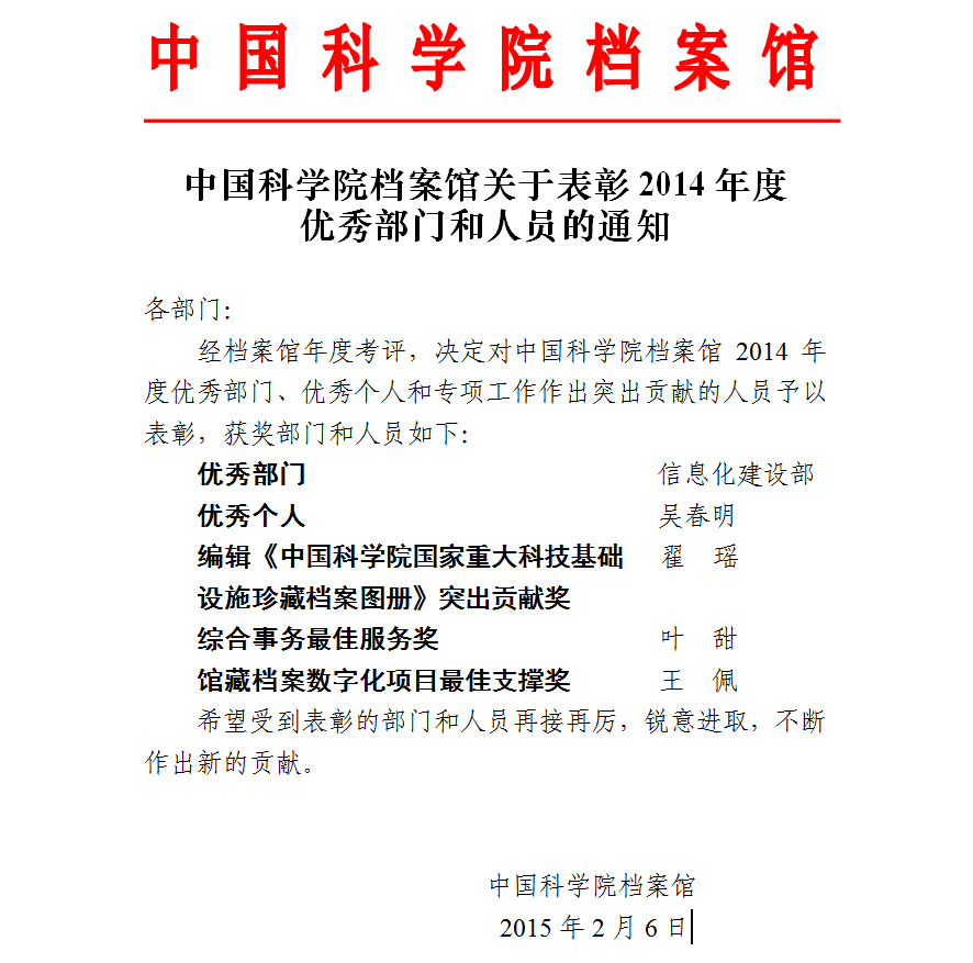 中国科学院档案馆关于表彰2014年度优秀部门和人员的通知