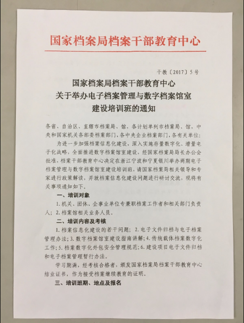 国家档案局档案干部教育中心关于举办电子档案管理与数字档案馆室建设培训班的通知