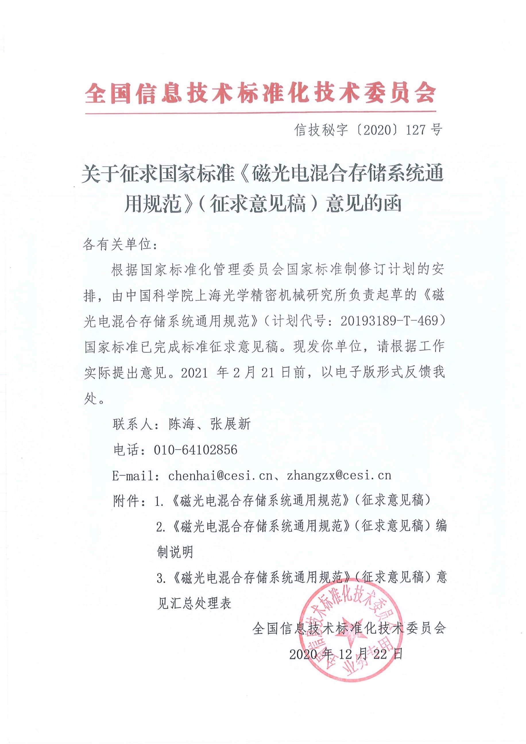 根据国家标准化管理委员会国家标准制修订计划的安排,由中国科学院上海光学精密机械研究所负责起草的《磁光电混合存储系统通用规范》(计划代号:20193189-T-469)国家标准已完成标准征求意见稿。现发你单位,请根据工作实际提出意见。2021年2月21日前,以电子版形式反馈我处。