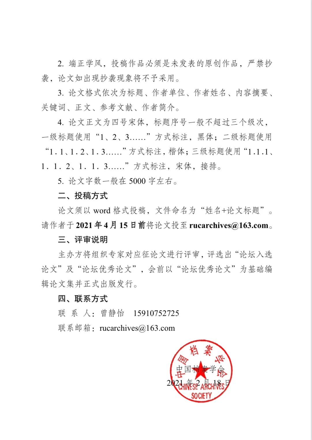 论文须以word格式投稿,文件命名为“姓名+单位+论文标题”。请作者于2021年4月12日前将论文投至zkydag@mail.las.ac.cn,由院档案馆统一向中国档案学会报送。