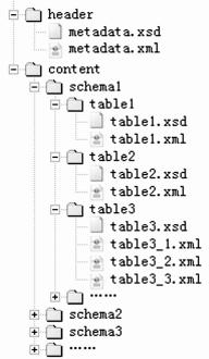 5.2 存储数据库元数据信息的 XML文件命名为metadata.xml,存储在 header文件夹中;存储每个数据表的数据的 XML文件以对应的数据表名称进行命名,存储在content文件夹中。可根据操作系统、内存、转换效率等实际情况确定单个 XML文件的大小,数据表的数据量较大时可分成多个XML文件。在content文件夹中可以根据数据库的逻辑结构建立相应的文件夹。