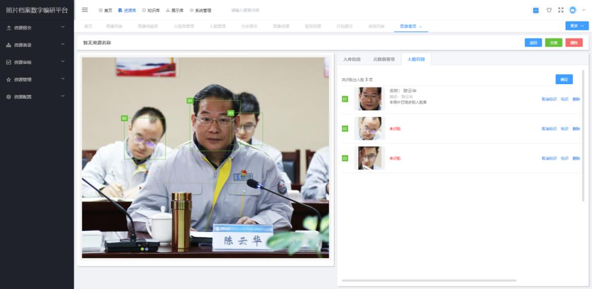 1.落实业务实际,打造基于存储管理、深层开发利用的照片档案资源库模块。“记忆两河口”平台的“照片档案资源库”可满足照片资源大数量级存储,实现“相似照片识别→元数据著录→内容标签识别”的工作流。“相似照片识别”对在线提交的照片资源进行相似照片识别、去重;“元数据著录”通过人机协作著录归档信息、内容信息、系统管理信息及其他信息;“内容识别”基于人脸识别等功能赋予照片人物标签属性。通过对照片档案内容的深层开发、实体标注,实现照片资源关联与组织。