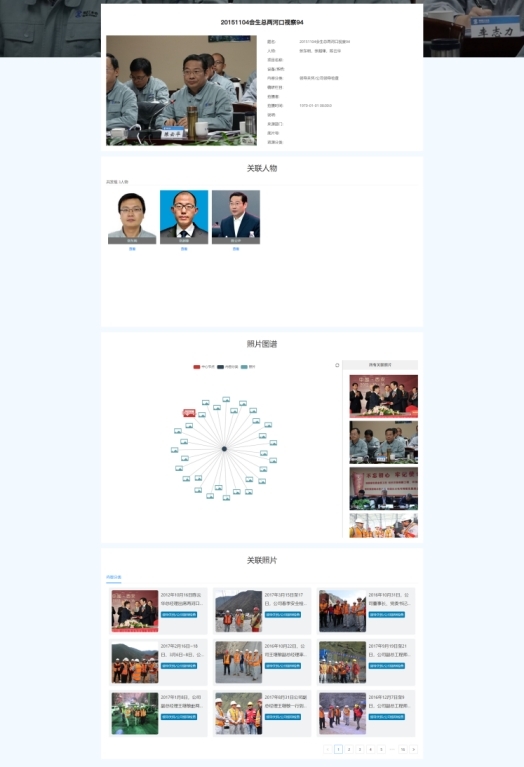 3.突破传统检索模式,丰富图库查询维度与图片展示效果。多功能图库支持多组配逻辑、多维度查询资源。多维度高级组配查询包括题名、时间、人物、部门、项目、设备、主题等检索项,并可分类索引。基于人脸识别标记照片中的人物,并推荐呈现该人物其他照片;基于知识图谱实现多维度知识要素信息的照片关联与可视化,自动聚合推荐同维度类别的其他关联照片。