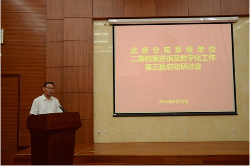 会议首先由潘亚男常务副馆长对二期档案进馆及数字化工作内容进行了全面解读,并强调了时间进度和验收要求。随后,大气所副所长、党委副书记王生林从所领导层面介绍推动落实档案进馆工作的思路与成效,过程工程所办公室副主任郭亚莉从主管部门层面介绍组织协调档案进馆工作的方法与经验。为加强该项工作的推动和落实,会议还宣读了北京分院系统各单位二期档案进馆工作领导小组、协调小组和专业小组名单。