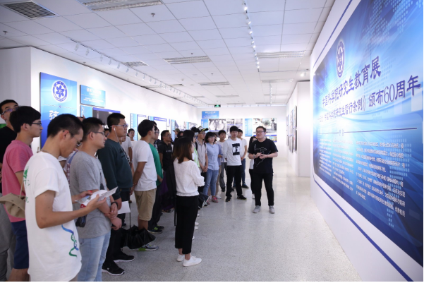 围绕中国科学院研究生教育的历程与特色,校档案馆从《中国科学院研究生教育展》中挑选了“毛泽东主席颁发的中国科学院印信”、“中国科学院研究生院揭牌仪式”、“中国科学院大学揭牌仪式”等反映学校历史沿革和学校机构演变历程的档案材料,共制作20块展板。自5月12日起,在四个校区同时布展,吸引了全校近2000名师生观看。在6月9日活动日当天,工作人员还引导对学校历史感兴趣的同学到中国科学院研究生教育展(该教育展共包含54块展板、172张照片)展厅进行参观。