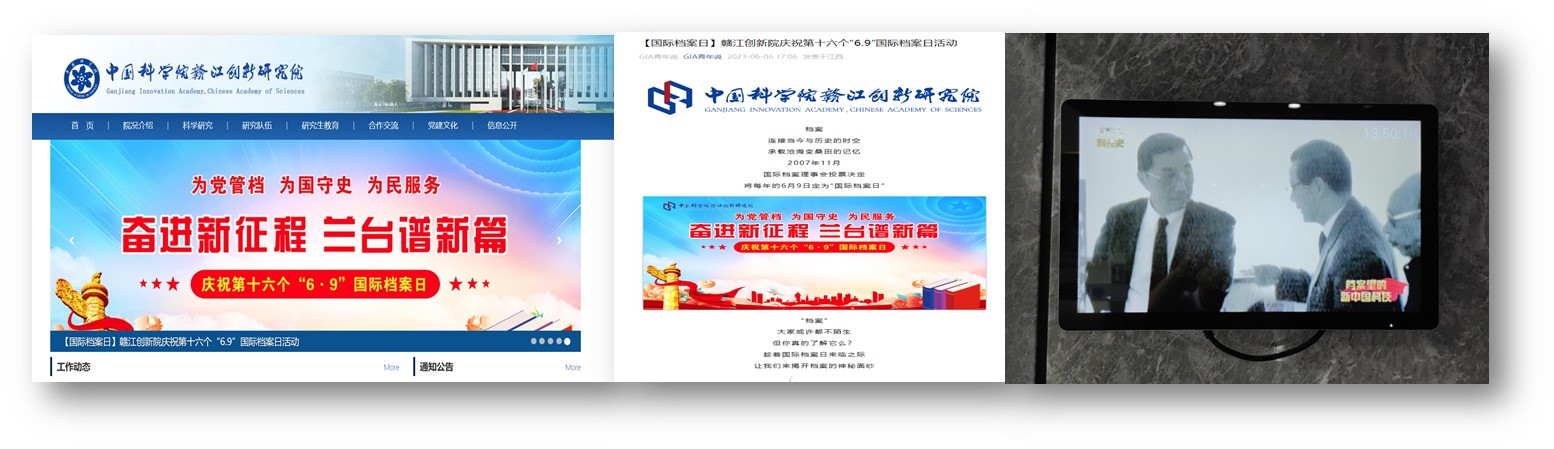 线上宣传活动,充分盘活中科院院内素材资源,通过在赣江创新院官网设置专题、“GIA青年说”微信公众号推文宣传、园区楼层宣传屏宣传片展播,将习近平总书记关于档案工作指示批示精神、中科院档案馆《档案里的新中国科技》、《中科院百部档案微视频》、《于无声处》等宣传片及国际档案日的知识内容进行集中宣传,营造良好的档案日宣传氛围。