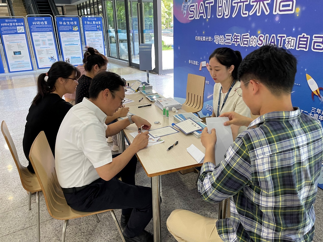 系列活动2:借助SIAT建院17周年的契机,6.9国际档案日当天在院校多个园区同步开展了“SIAT时光来信 启航”存档征集计划,主题为“写给三年后的SIAT和自己”。活动贯彻人人都是档案人,亲自书写档号、盖档案章、封袋等,让参与者体验档案归档流程,对档案工作有更直观的感受。综合档案室将对时光信箱中的信件进行统一归档、保管封存,计划在2026年SIAT建院20周年之际进行返航计划。广州分院副院长、SIAT院长及院内多位领导、师生员工参与活动,该活动有温度、有深度、有广度的理念收获了大家的一众好评。