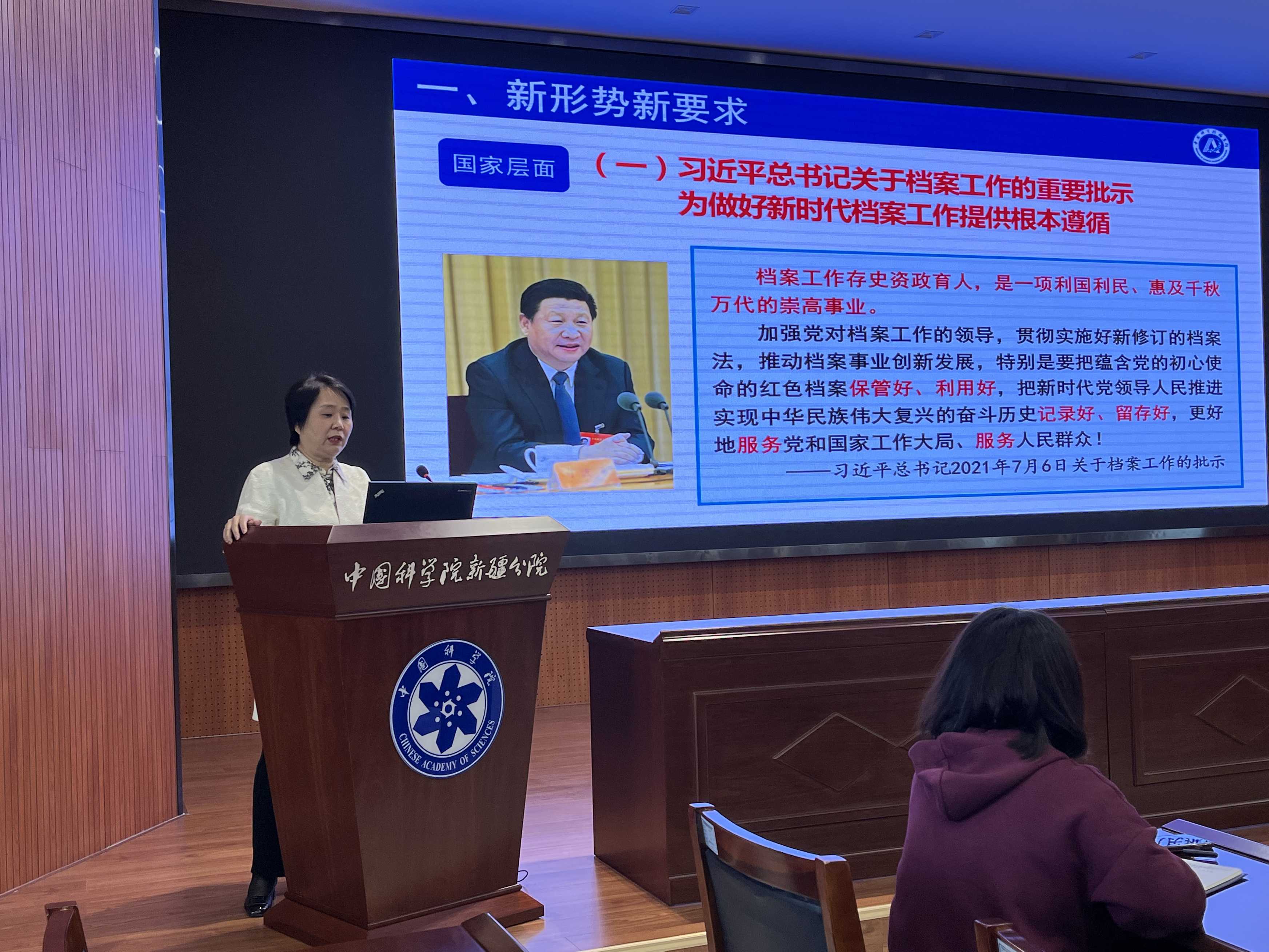 潘亚男作题为《聚焦重点 狠抓落实 推进全院档案工作高质量发展》的报告,解读了中国科学院档案工作推进会精神和《中国科学院“十四五”档案工作发展规划》8个方面25项重点任务,结合重点任务分析新疆分院系统档案工作现状,提出改进措施。她强调,做好档案工作要认真贯彻落实习近平总书记关于档案工作重要指示批示精神,档案工作是党和国家工作中不可缺少的基础性工作,事关科技事业的长远发展,要加强依法依规治档,持续推动我院档案工作高质量发展。