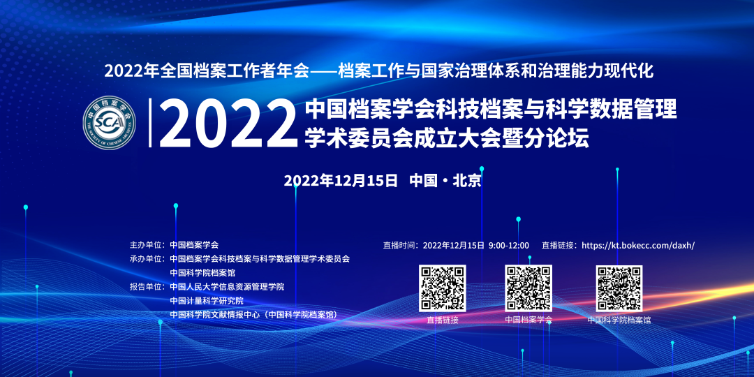2022年12月15日上午,由中国档案学会主办、中国科学院档案馆承办的中国档案学会科技档案与科学数据管理学术委员会(以下简称“委员会”)成立大会暨分论坛顺利召开。中央档案馆副馆长、国家档案局副局长付华,国家档案局经济科技档案业务指导司司长李忱,中国档案学会副理事长、秘书长邓小军出席成立大会并讲话。国家档案局经济科技档案业务指导司副司长蔡盈芳、中国档案学会副秘书长刘峰、监事会秘书长牛力教授等应邀出席成立大会。来自部委机关、省局馆、科学数据中心、高校、企业事业单位的50余名候选委员参加了成立大会暨分论坛,全国各地共600余名档案工作同仁观看了分论坛直播。