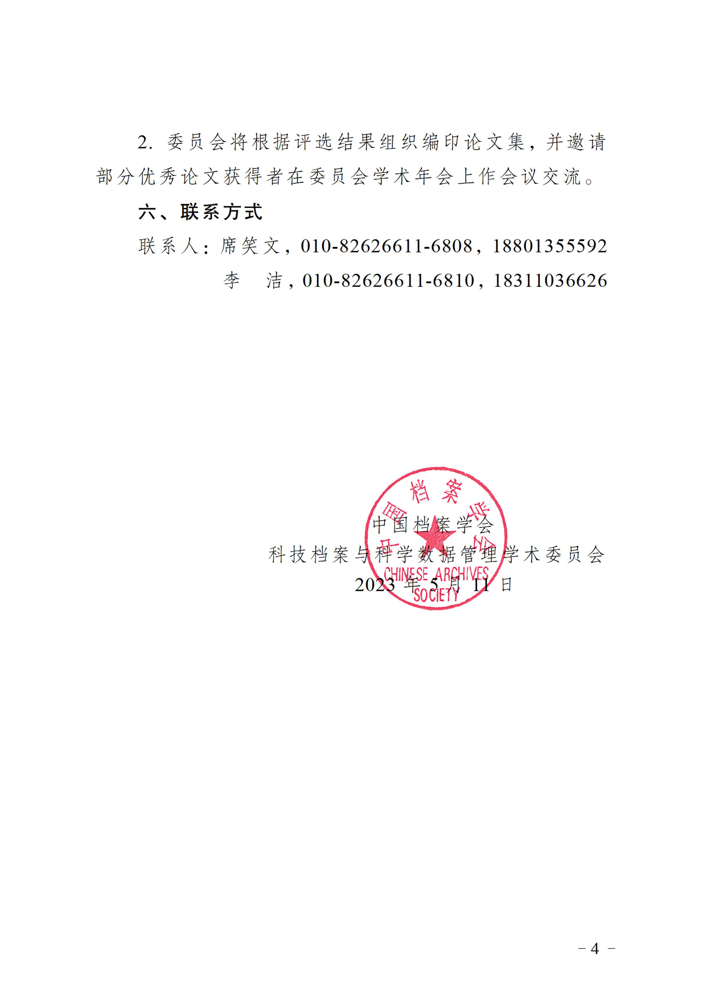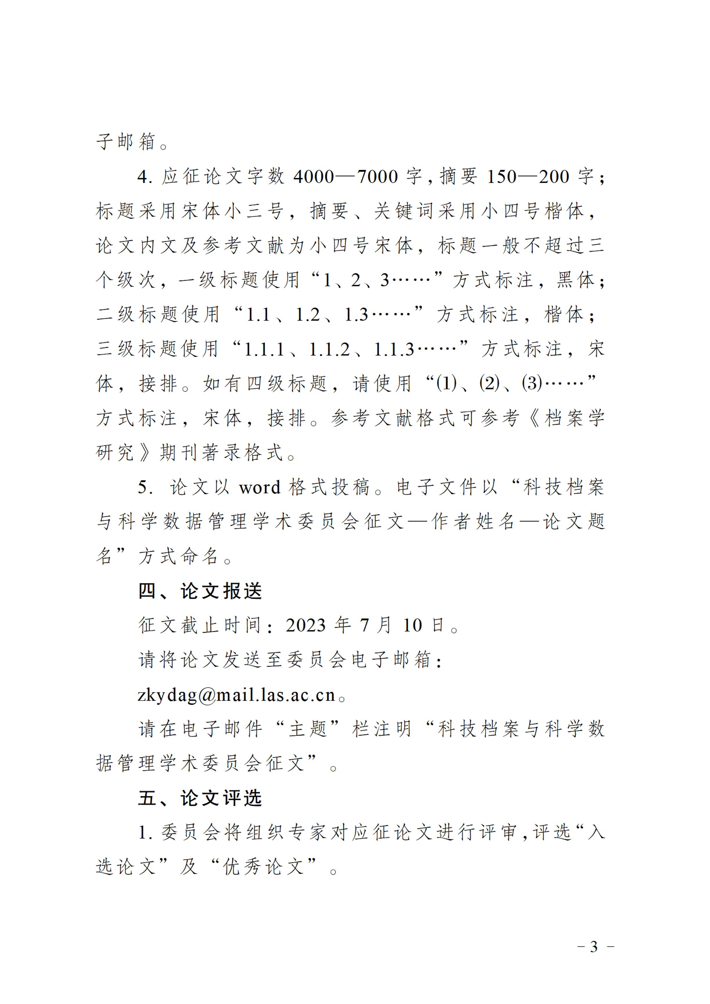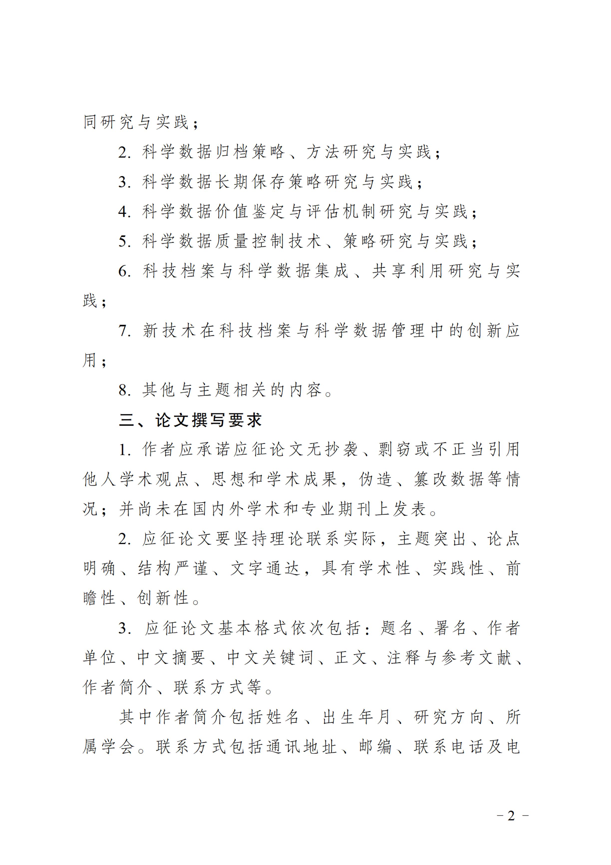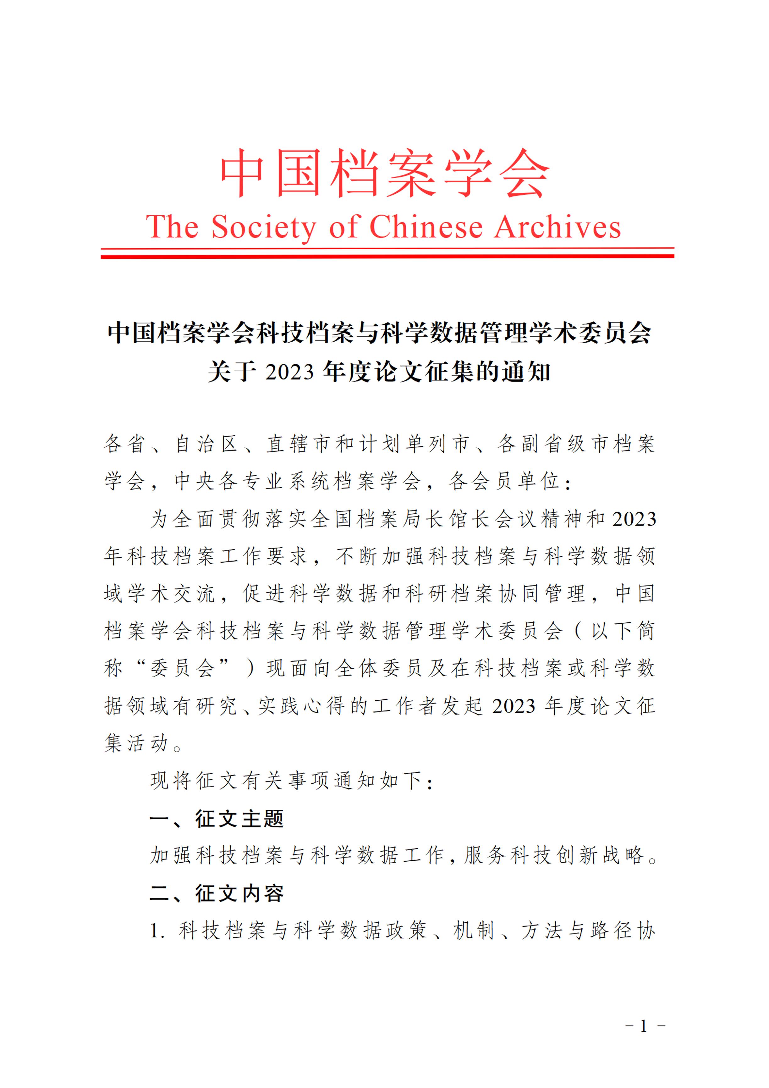 为全面贯彻落实全国档案局长馆长会议精神和2023年科技档案工作要求,不断加强科技档案与科学数据领域学术交流,促进科学数据和科研档案协同管理,中国档案学会科技档案与科学数据管理学术委员会(以下简称“委员会”)现面向全体委员及在科技档案或科学数据领域有研究、实践心得的工作者发起2023年度论文征集活动。现将印发的《中国档案学会科技档案与科学数据管理学术委员会关于2023年度论文征集的通知》(以下简称“通知”),欢迎大家积极参与,踊跃投稿!